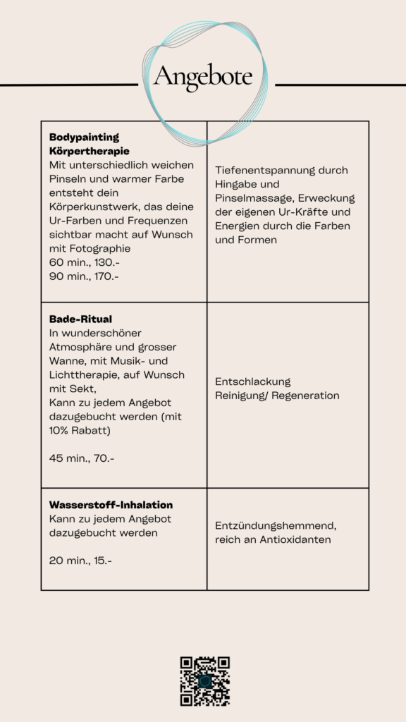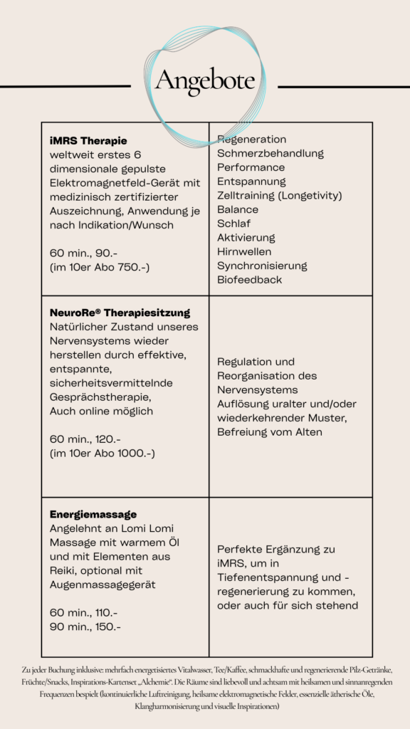 Körperbasierter Heilraum (Reiki, Magnetresonanzfeld, Lomi-Lomibasierte Massage)